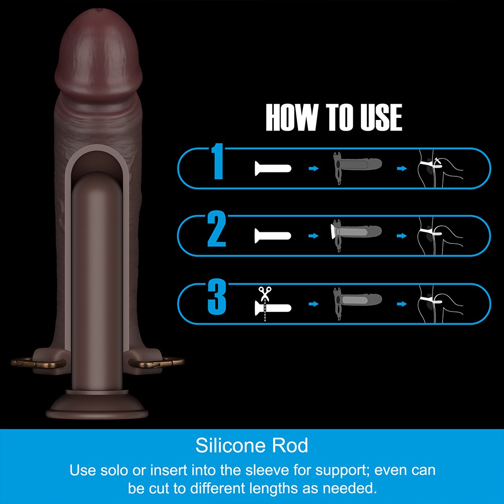 Kiváló minőségű anyagból készített, realisztikuskialakítású, puha, rugalmas, erezett felületű dildó, állítható tépőzárral ésrugalmas hevederekkel rendelkező hámmal. A szett tartalmaz egy szilikon rudattapadókoronggal, amelyet be lehet helyezni az üreges hüvelybe továbbitámasztékért, vagy anális dugóként is használható, így kielégítve afelhasználók különböző igényeit. A szilikon rúd további támaszt éssokoldalúságot biztosít, így elengedhetetlen kiegészítője lesz gyűjteményének.A behelyezhető szilikon rúd erekciót elősegítő eszközként is működik, kitöltvea pénisz feje és a hüvely vége közötti légrést. A tapadókorongot levághatja, arudat pedig különböző hosszúságúra vághatja, így a hüvely belsejében améretének megfelelően testre szabhatja. A hám 102 cm derékbőségig állítható.