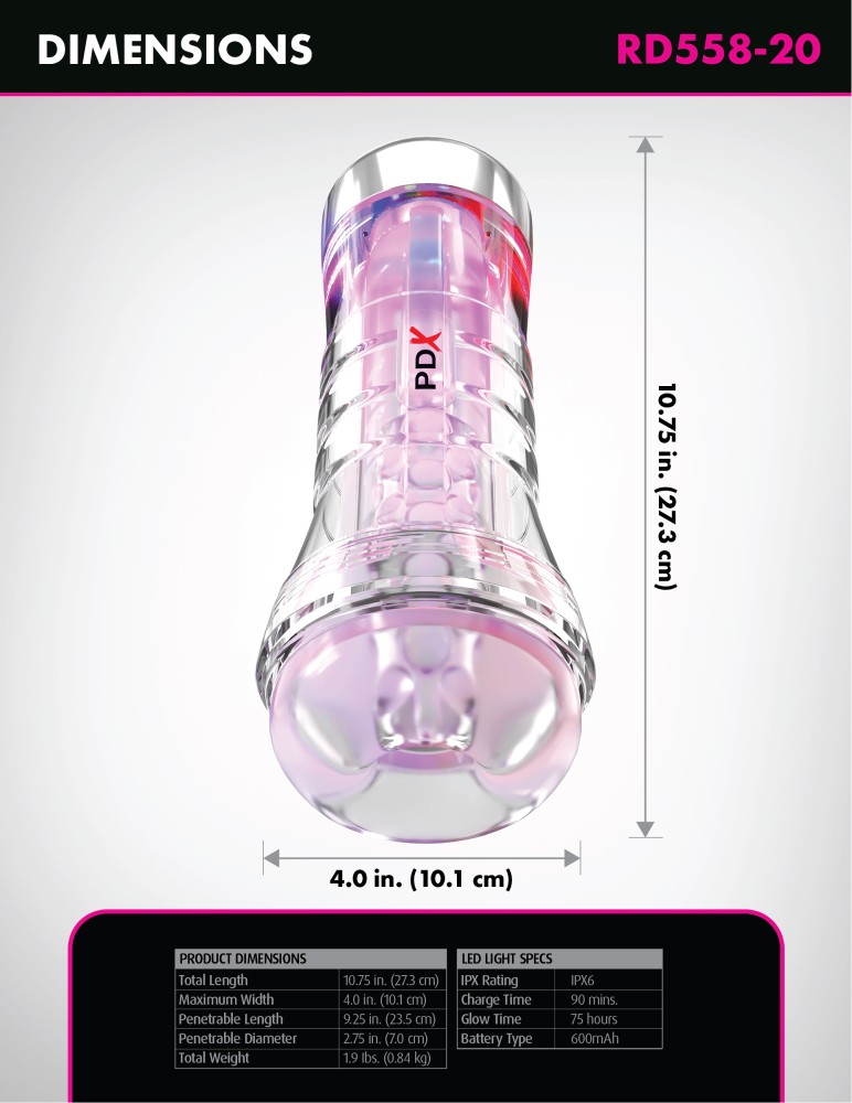 Kiváló minőségű anyagból készített, vizuális stimulációfokozására is tervezett, átlátszó, LED-es világítással felszerelt maszturbátor,melynek betétje gömbökkel van ellátva. Használatával az aktus közbeniönkontroll nagy mértékben fejleszthető, így annak ideje jelentősennövelhető.